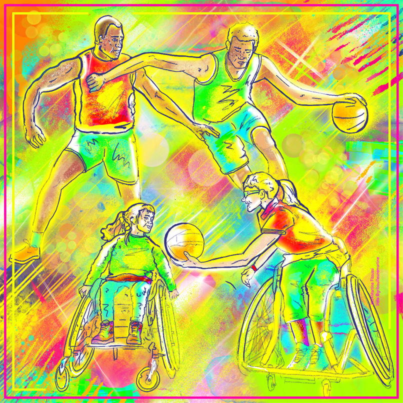 Une mise en miroir du sport de haut niveau, des sportifs héroïques handicapés avec la pratique du sport en famille.